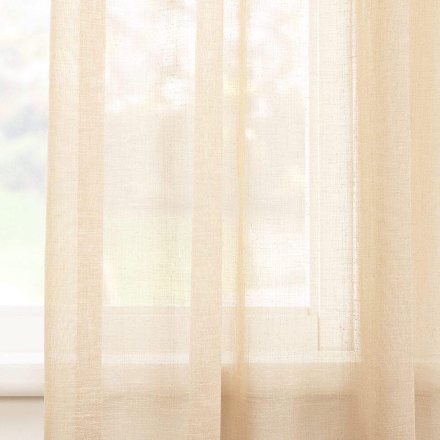 Open geweven vitrage met een natuurlijk ogende linnenlook. De stof is kamerhoog zodat in de confectie geen naden zichtbaar zullen zijn. Aan de onderzijde van de stof is een verzwaringskoord gemaakt, zodat deze prachtig valt en er geen zoom in hoeft.